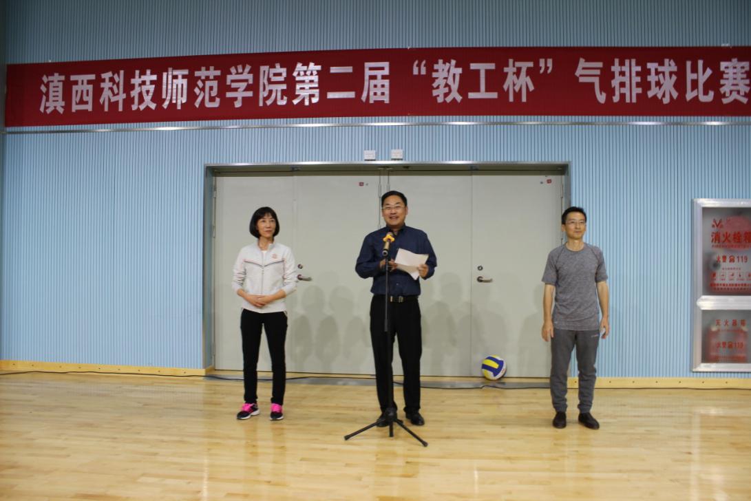 为喜迎滇西科技师范学院建校40周年,进一步提高教职工身体素质,丰富校园文化生活,由校工会举办,体育学院、生物技术与工程学院承办的第二届“教工杯”气排球比赛于10月25日在学校综合训练馆举行。校党委副书记李国钰出席开幕式并致辞。李国钰传达了学校党委行政对职工体育运动的重视,强调了好身体是教师做好教书育人工作的本钱,健康是永远的财富,鼓励大家加强体育锻炼,在比赛中“赛出友谊、赛出水平、赛出风格、赛出境界”。